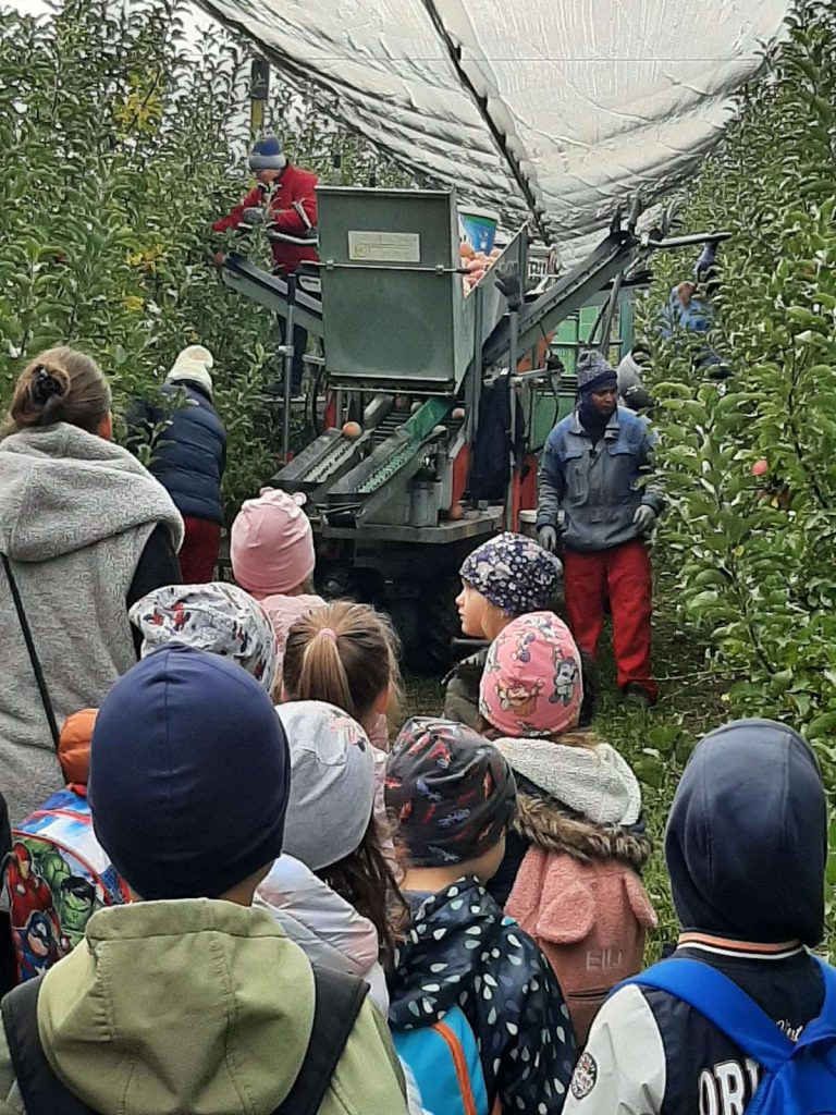 Željana Jagoš, tehnolog u Voćnjaku Nedelišće d.o.o., srdačno je dočekala djecu i provela ih kroz voćnjak. Ispričala im je priče o voćnjaku, objasnila koliko pažnje i truda stoji iza svakog stabla i ploda te pokazala strojeve koji pomažu u berbi. Djeca su promatrala kako ljudi beru jabuke i stavljaju ih na stroj, koji ih zatim spušta u velike kašete.